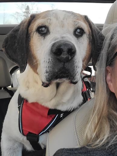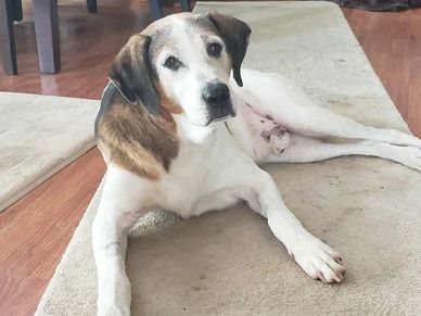This boy is a lover. He gets along with everyone. He is totally vaccinated and neutered. Purdy is thriving in his foster home and is soaking in all the snuggles he can. He walks well on a leash and wanders a bit on his off leash walks but doesn't go far. His owner moved overseas and left this beautiful 8 year old hound cross at the shelter. Please consider this handsome senior boy. He's such a flirt. Look at that wink. Purdy is being fostered in Stayner.